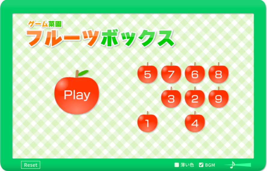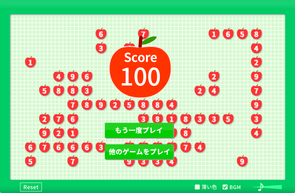 画面上をマウスでドラッグして、数字の合計が10になるようにリンゴを囲むパズルゲームです。(説明) iPhone,iPadやAndroidでも動作します。